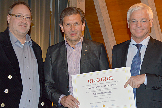 Für seine Verdienste um das Zimmererhandwerk erhielt Josef Zachmeier (Mitte, Neumarkt) die Silberne Ehrennadel des bayerischen Zimmererverbandes. Bezirksvorsitzender Thomas Deß (l.) und Präsident Peter Aicher (r.) gratulierten.
